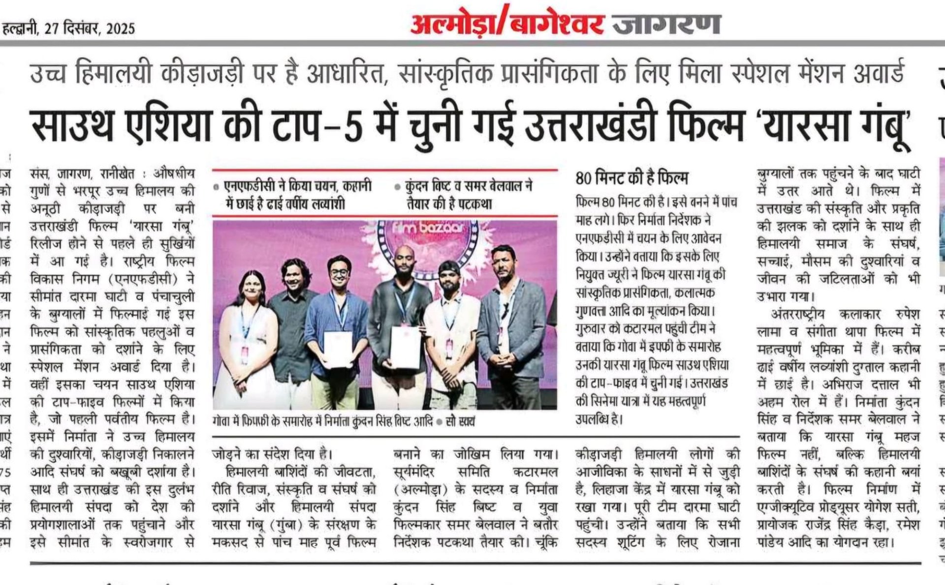 At NFDC WAVES FILM BAZAAR Powered By Netflix 2025 GOA, Yarsa Gambu - written and Directed by Samar Belwal was film was officially selected among the top 5 feature films across South Asia and Won Prasad Corporation Special Mention Award.
